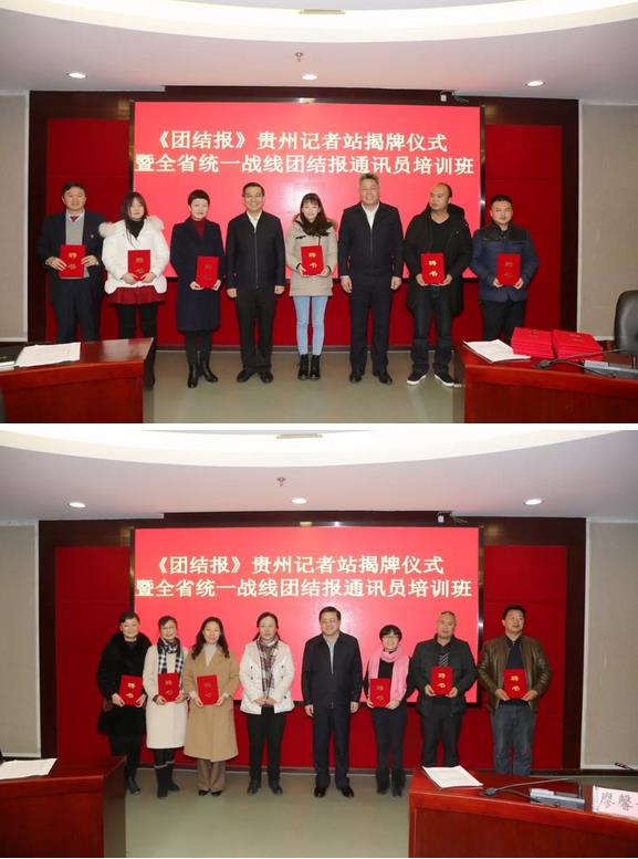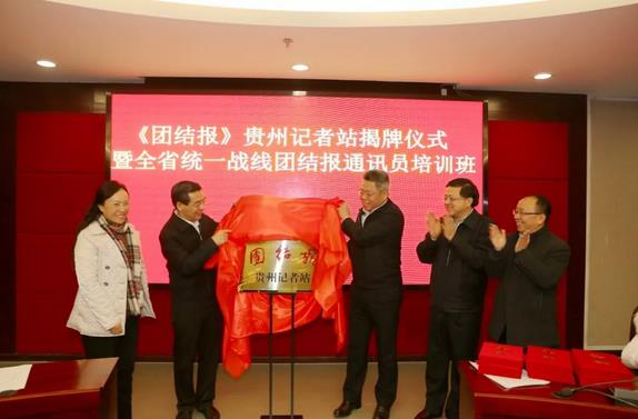 12月27日,《团结报》贵州记者站揭牌仪式暨全省统一战线《团结报》通讯员培训班在贵阳举行。李惠东、王世杰,团结报社社长邵丹峰,民革贵州省委会副主委尹晓芬出席仪式。民革贵州省委会秘书长邓文淼主持仪式。