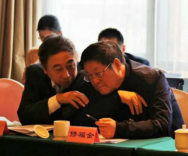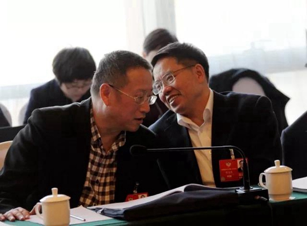 3月5日下午,傅惠民委员(右)在民革小组讨论会上与郑建邦委员交流。