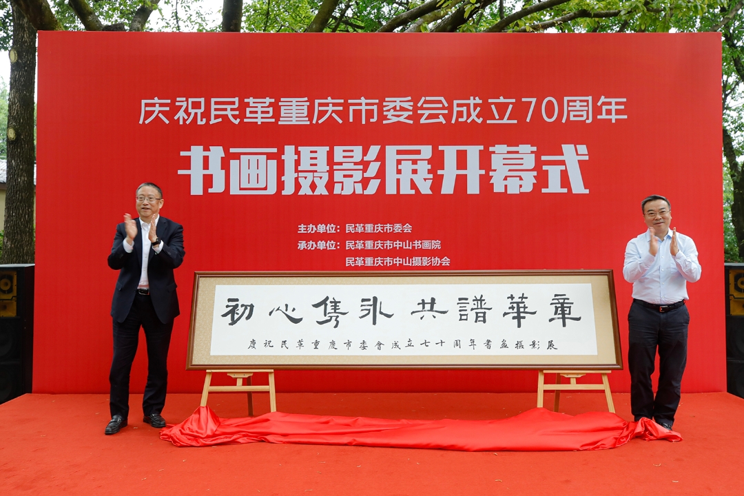 郑建邦和商奎为庆祝民革重庆市委会成立70周年书画摄影展揭幕