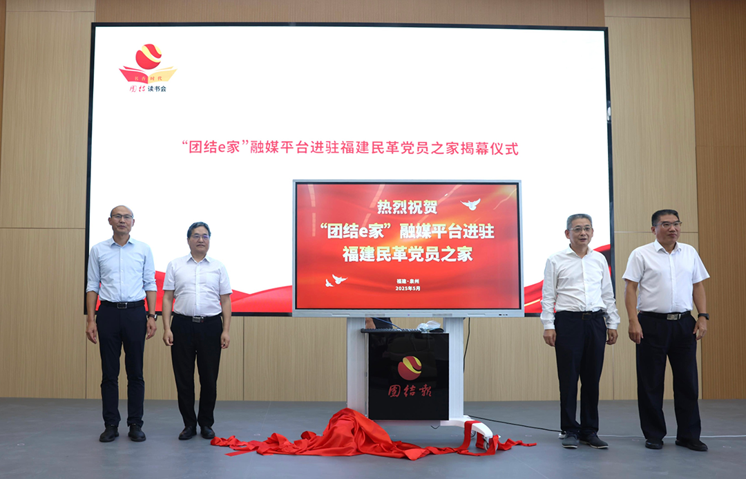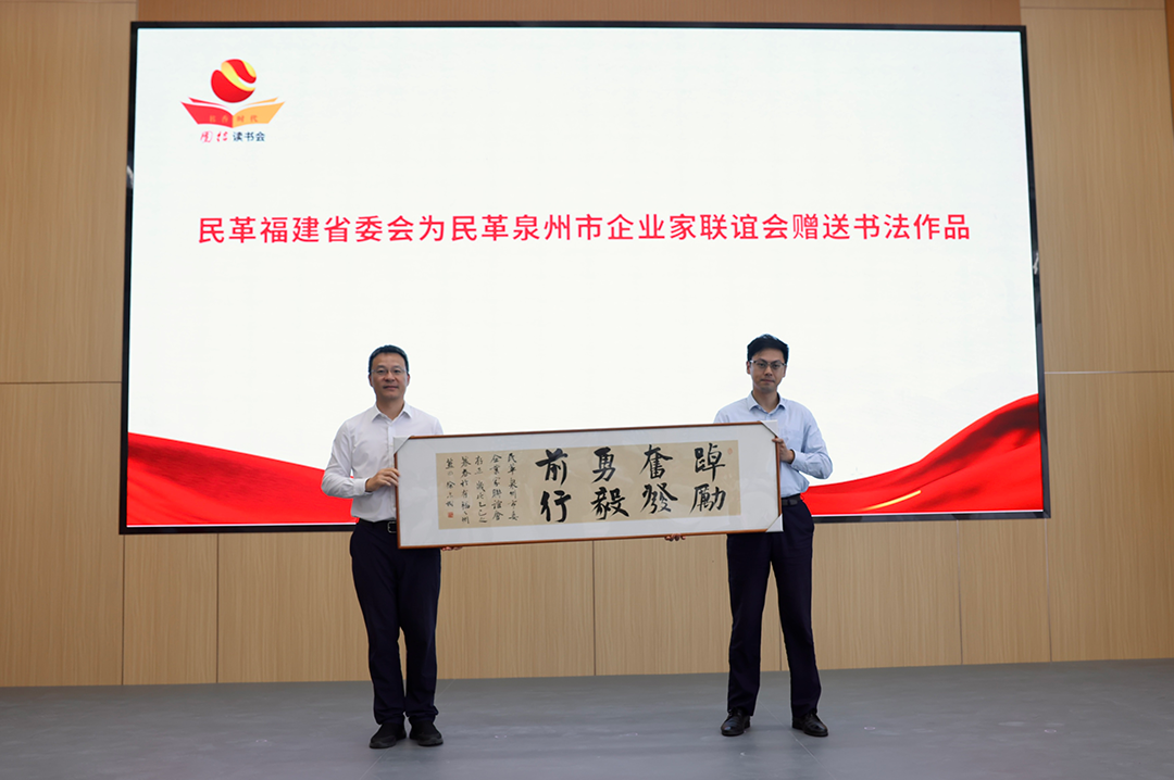 读书会上还举行了“团结e家”融媒平台进驻仪式、民革福建省委会向民革泉州市企业家联谊会赠送书法作品仪式,大家观看了金句诵读、《同心向党》表演并合唱闽南语歌曲《爱拼才会赢》。