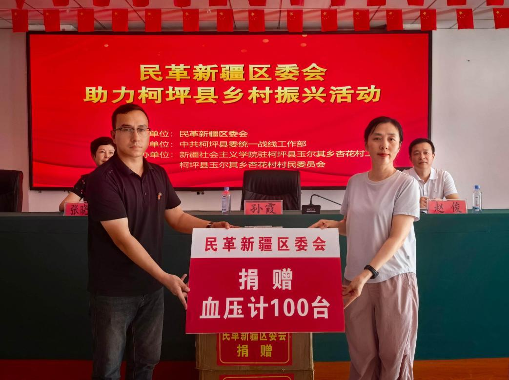 7月22日,民革新疆区委会赴阿克苏地区柯坪县玉尔其乡杏花村开展助力乡村振兴社会服务,向村民捐赠100台电子血压计。民革新疆区委会专职副主委孙霞、民革阿克苏市委会主委张晓岚、新疆社会主义学院驻杏花村工作队队长张林鹏参加捐赠仪式。中共柯坪县委常委、统战部部长赵俊致欢迎词,杏花村90余名村民参加活动。