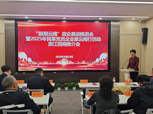 10月24日,民革中央联络部部长(主持社会服务部工作)张庆盈、民革云南省委会主委于干千共同率队赴杭州召开“旅居云南”政企恳谈推进会暨2025年民革党员企业家云南行活动浙江招商推介会。民革浙江省委会副主委徐铭恩出席会议并致辞,民革云南省委会专职副主委王智勇主持会议。