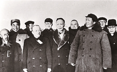 1949年3月25日,毛泽东率中共中央机关和人民解放军总部进入北平,同前来迎接的民主党派负责人和其他民主人士在西苑机场合影。左四为李济深。