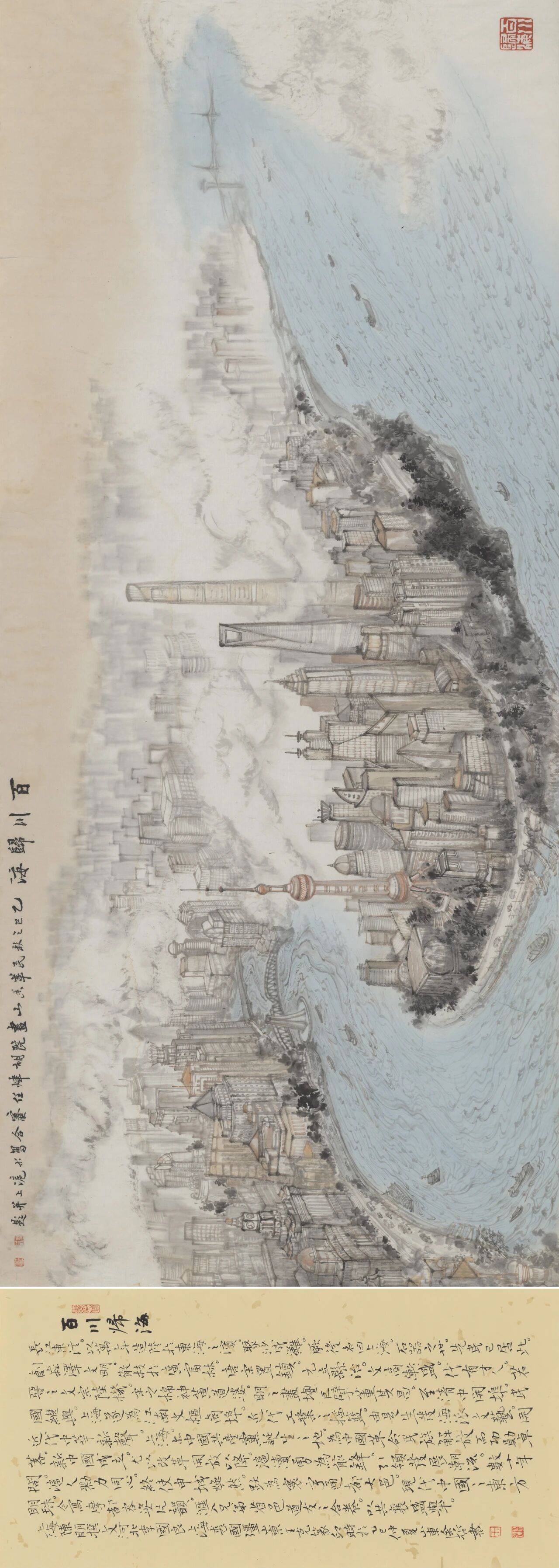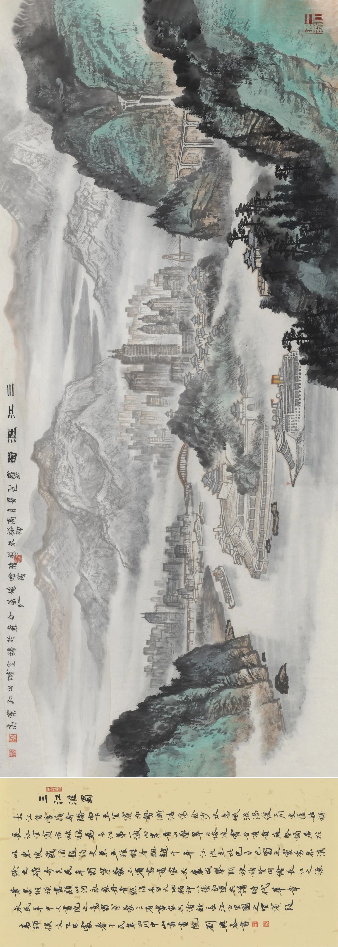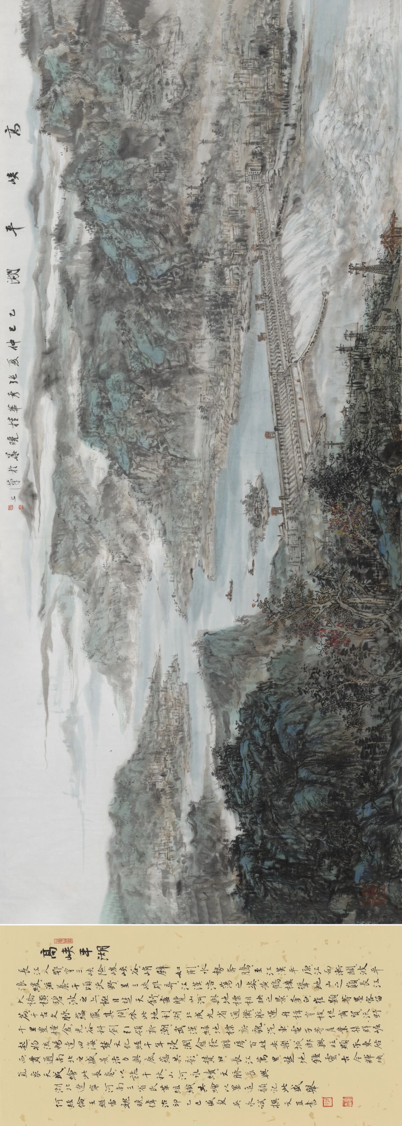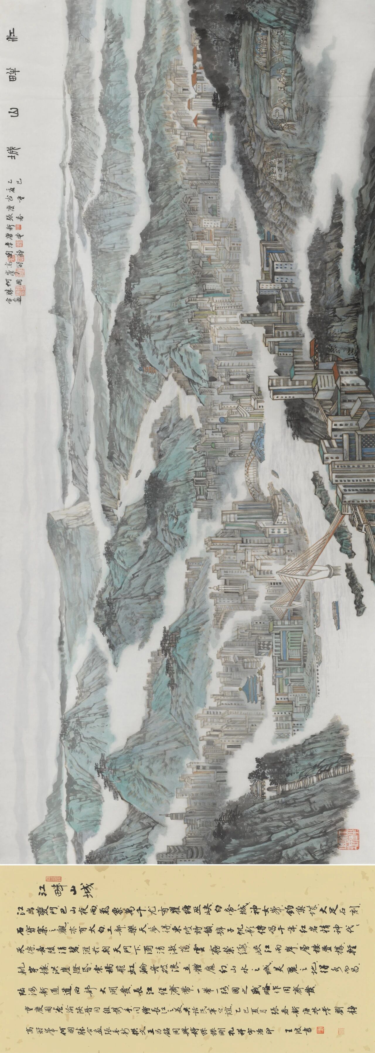 重庆图卷,渝陕晋同组携手,同绘长江之美,共话民革之谊。乙巳年六月于重庆,张春新、唐楚孝、刘静、高冠峰、何国胜合画,张春新撰文,王昌铭、周兴婷、孙振刚、孔祥宇治印,王波书。