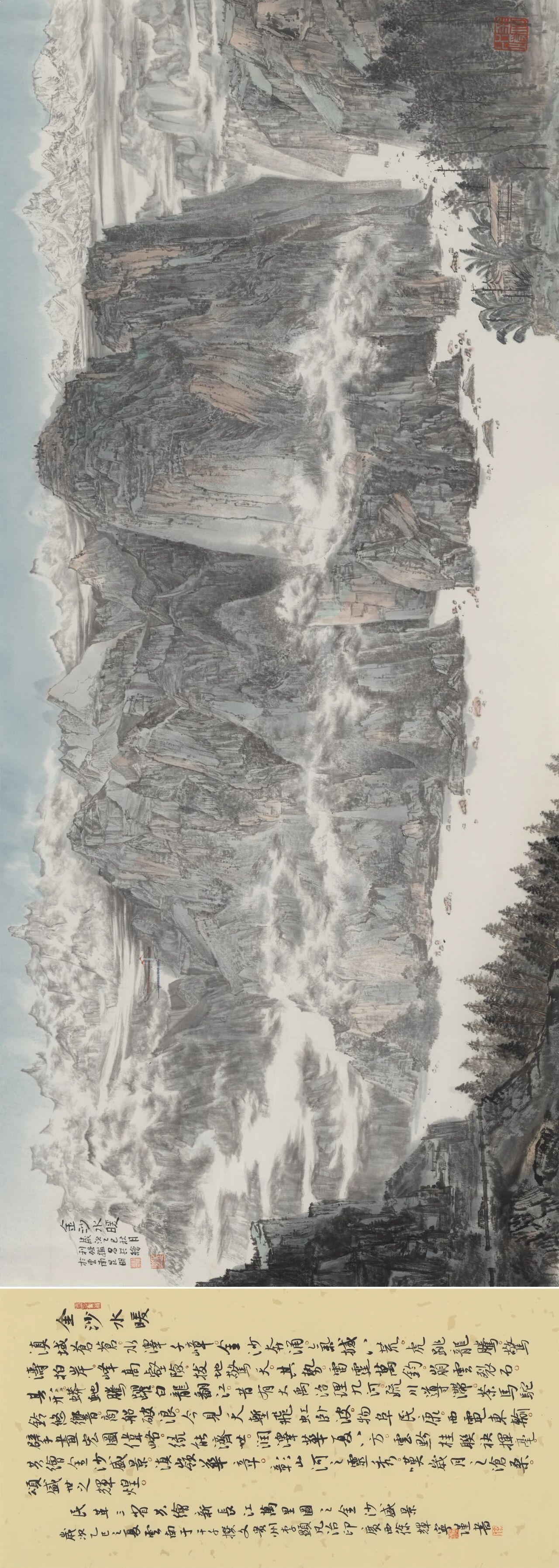 民革三省共绘新长江万里图之金沙盛景。岁次乙巳夏日,云南于干千撰文,贵州李显凡治印,广西徐辉宁谨书。
