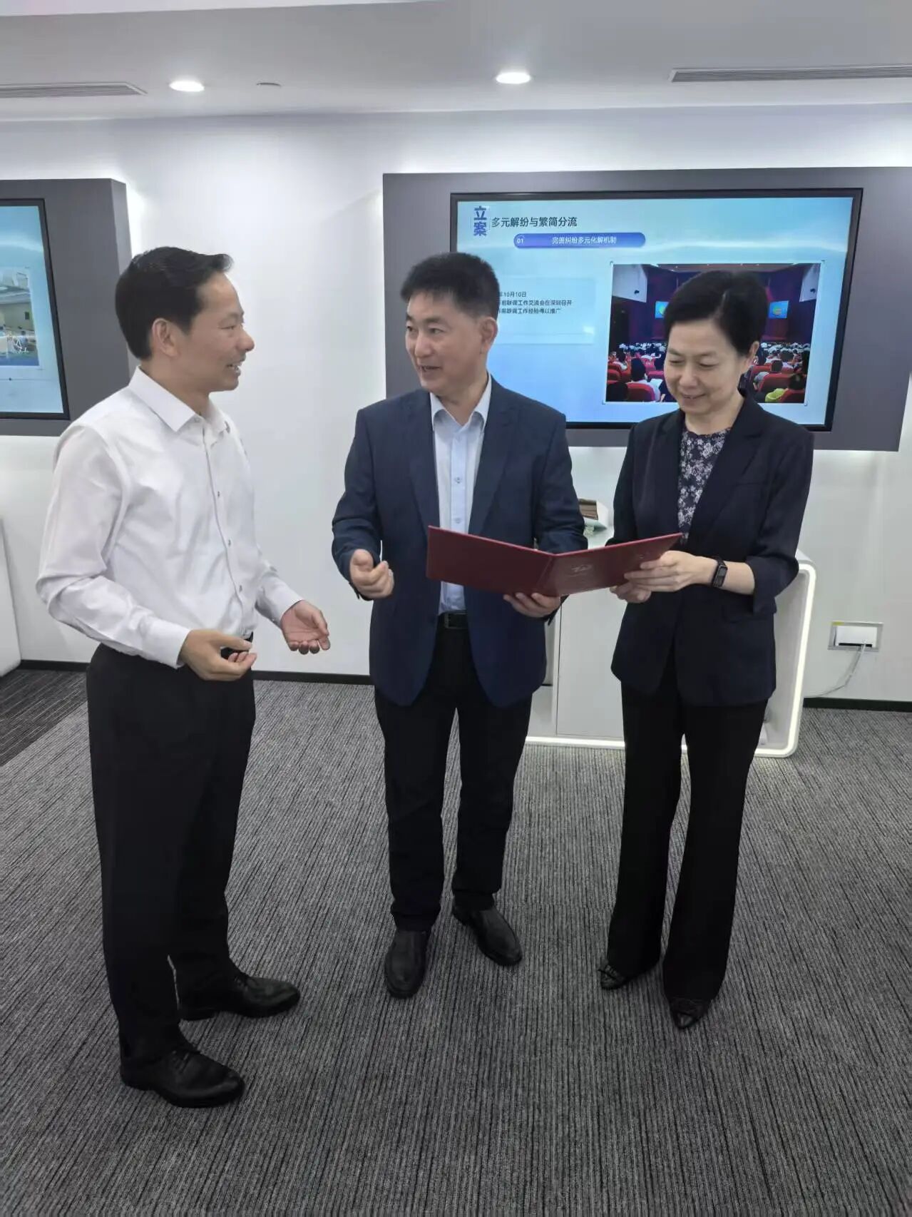 何杰(中)在参加“智能化司法应用研发建设调研座谈会”间隙,与深圳市中级人民法院院长赵菊花(右)及人民法院出版社社长余茂玉(左)交流。